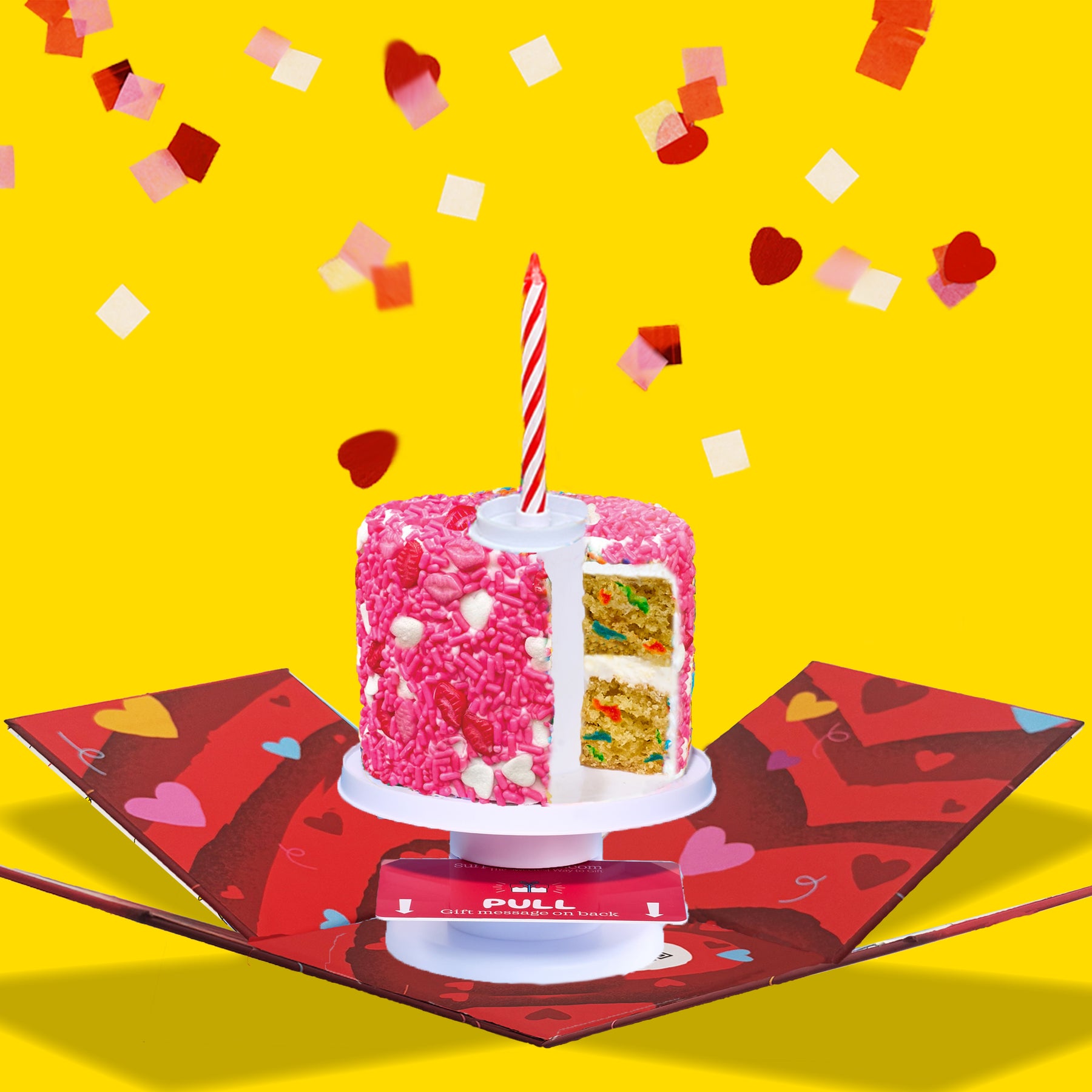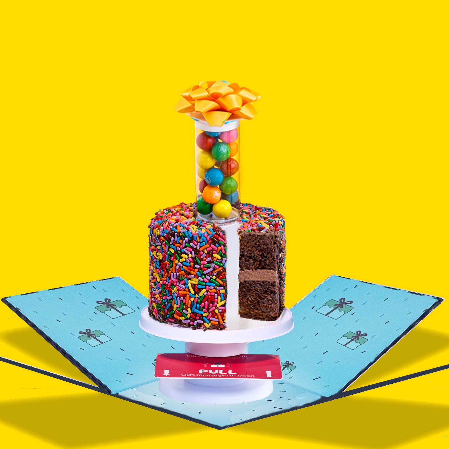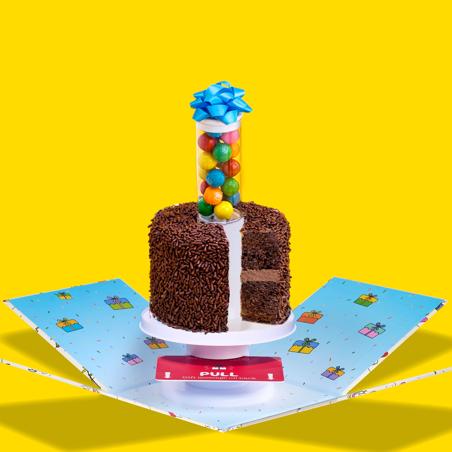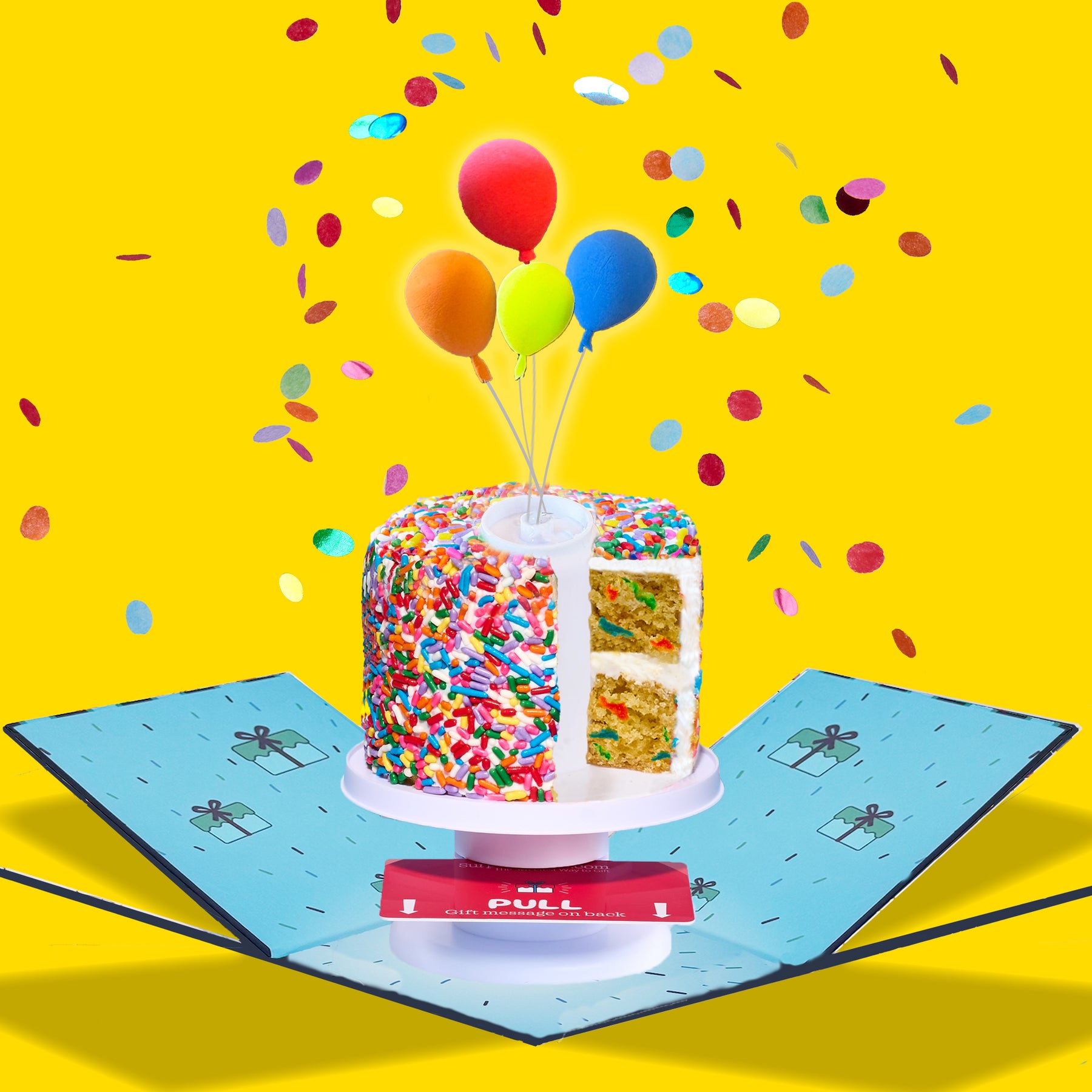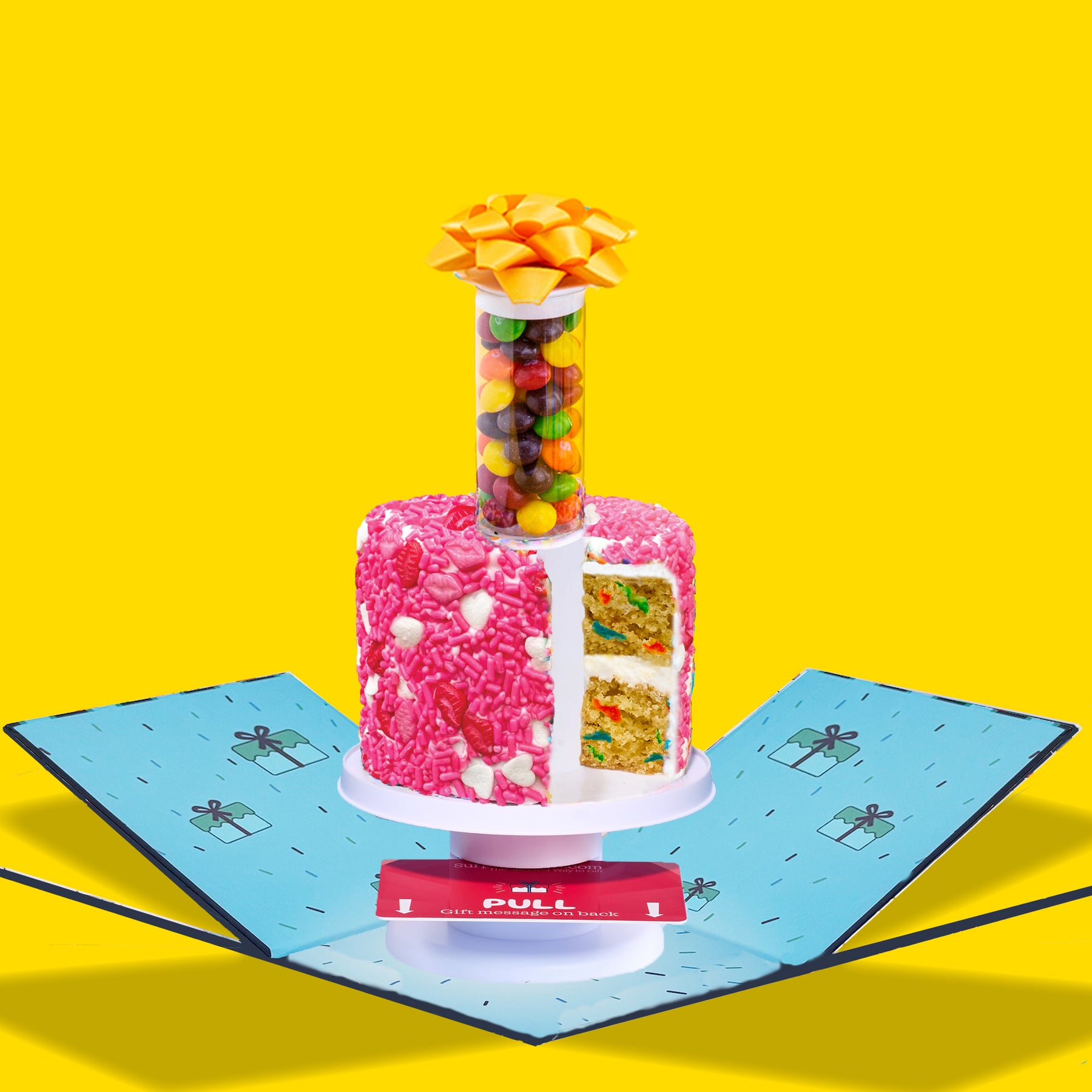 All Surprise Cakes include your choice of our delicious 4" cake, filled surprise gift pod, explosion gift box, and pull-card trigger with gift message on the back. Take your gift to the next level by adding an optional gift card from select retailers. Your gift arrives fully assembled and ready to pop on our patented mini Popping Cake Stand. And don’t worry, they won’t know it’s from you or us until their surprise POPS out!
