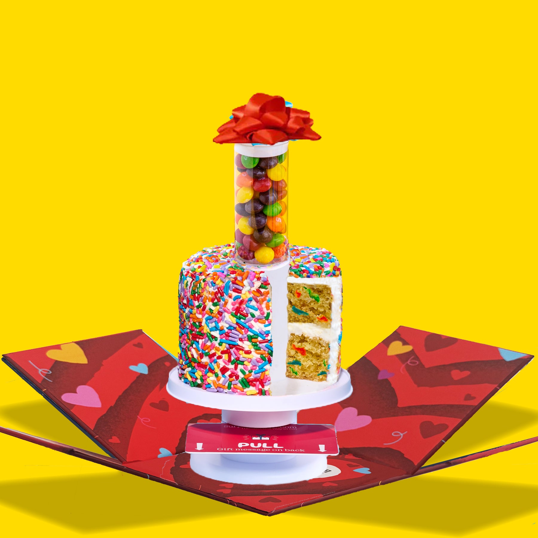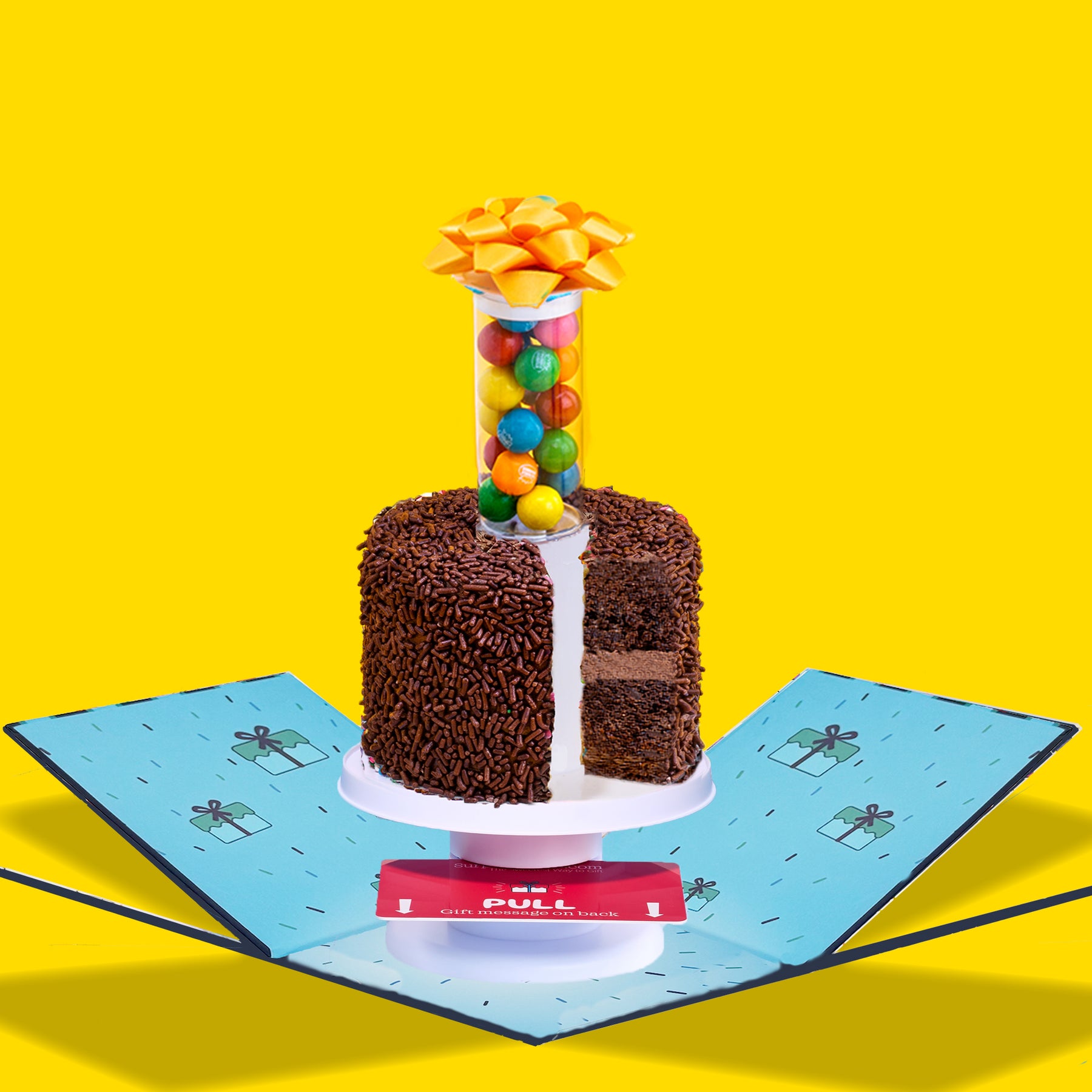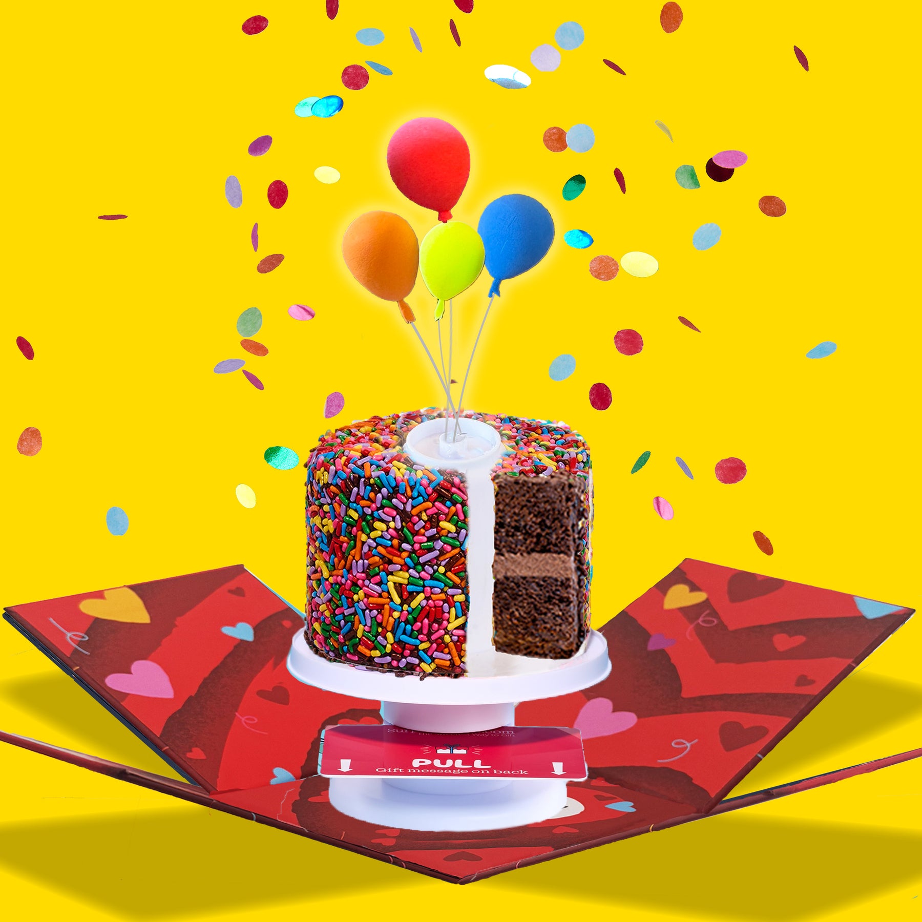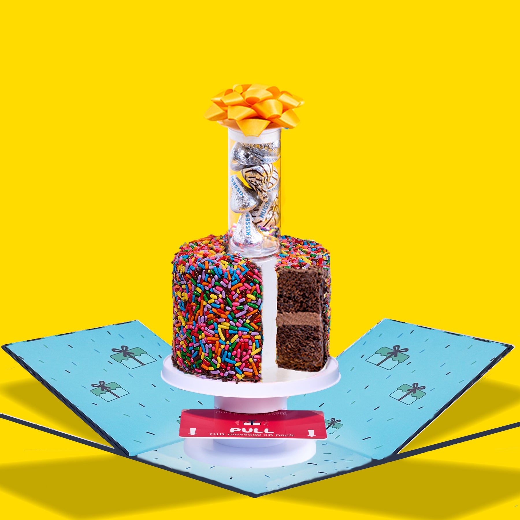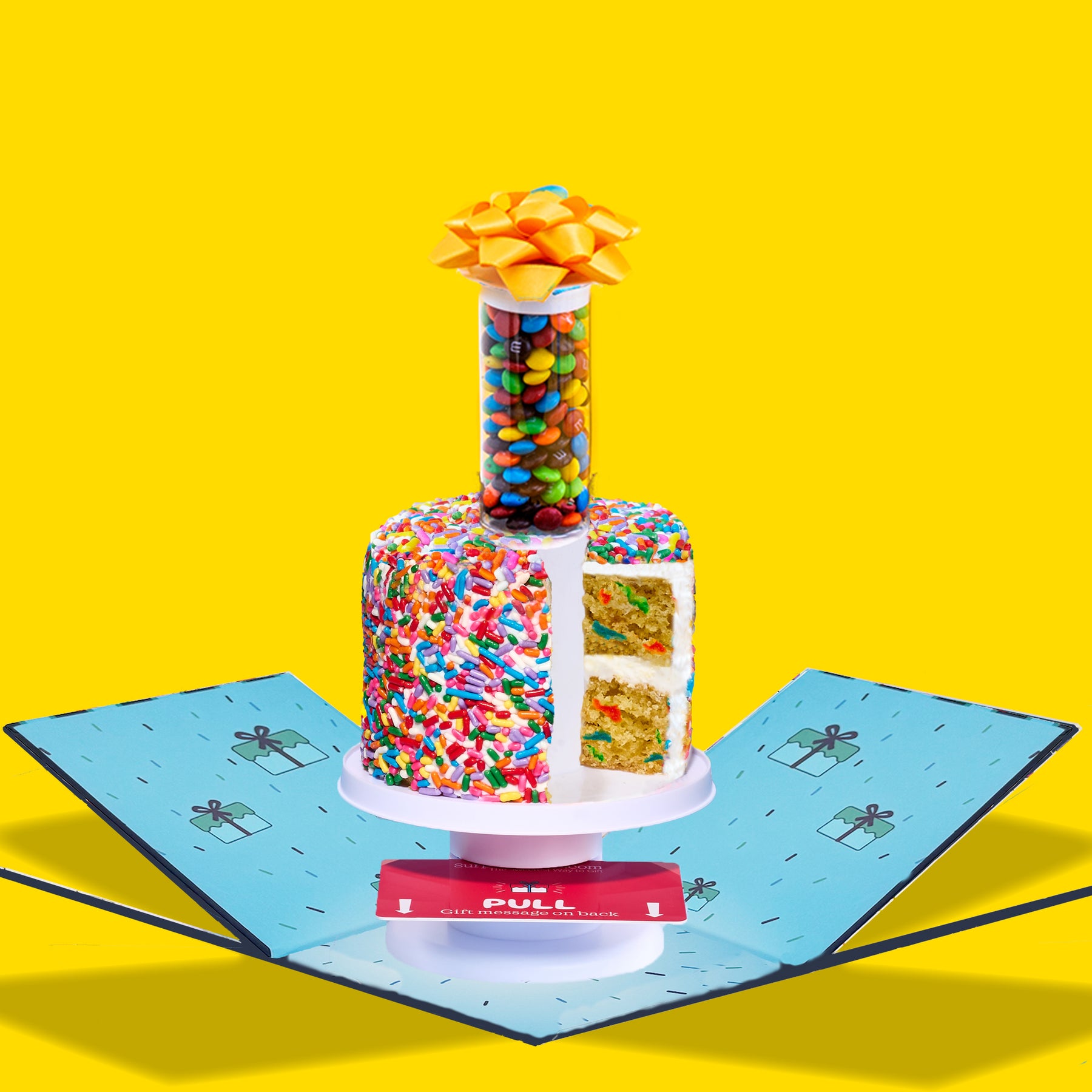 All Surprise Cakes include your choice of our delicious 4" cake, filled surprise gift pod, explosion gift box, and pull-card trigger with gift message on the back. Take your gift to the next level by adding an optional gift card from select retailers. Your gift arrives fully assembled and ready to pop on our patented mini Popping Cake Stand. And don’t worry, they won’t know it’s from you or us until their surprise POPS out!