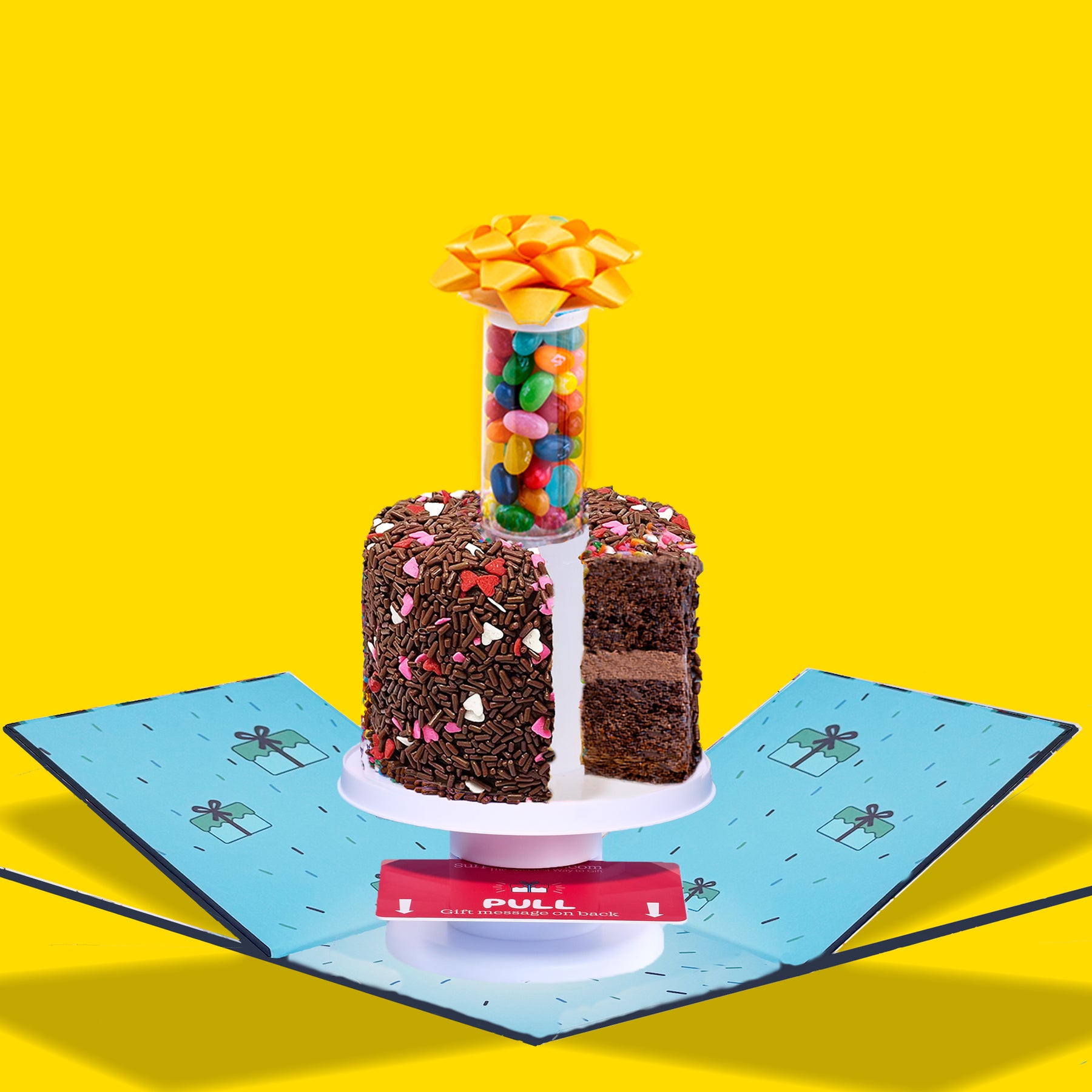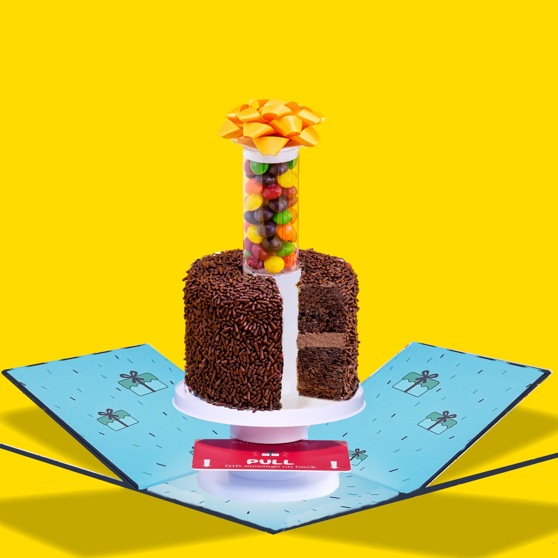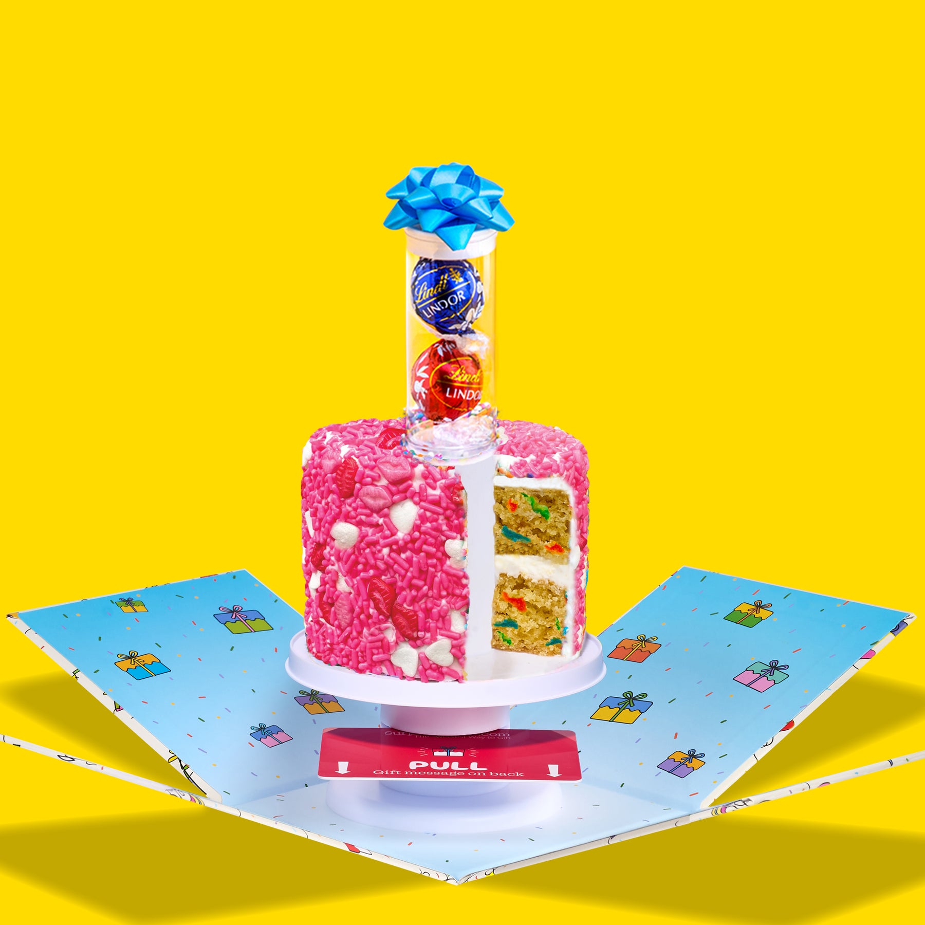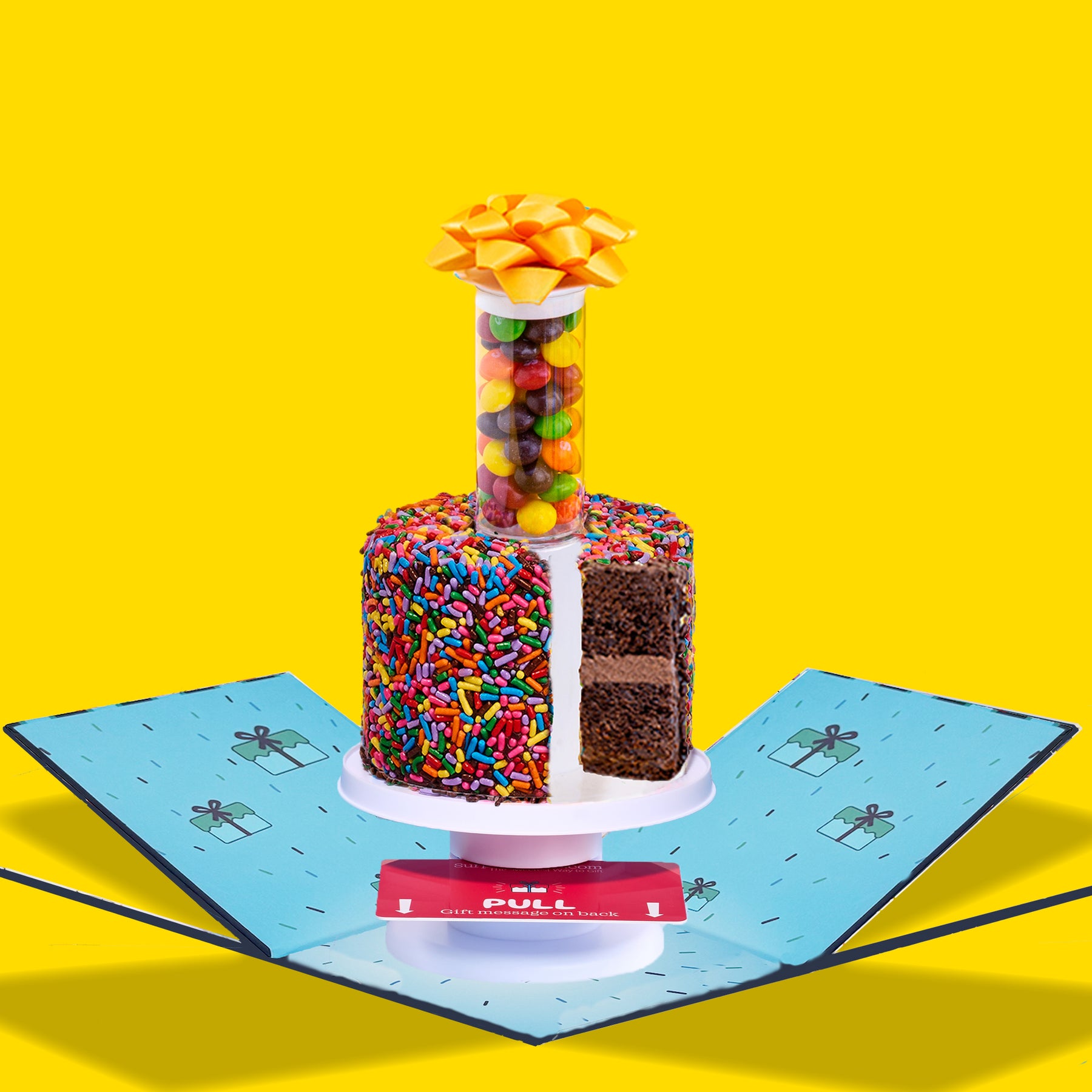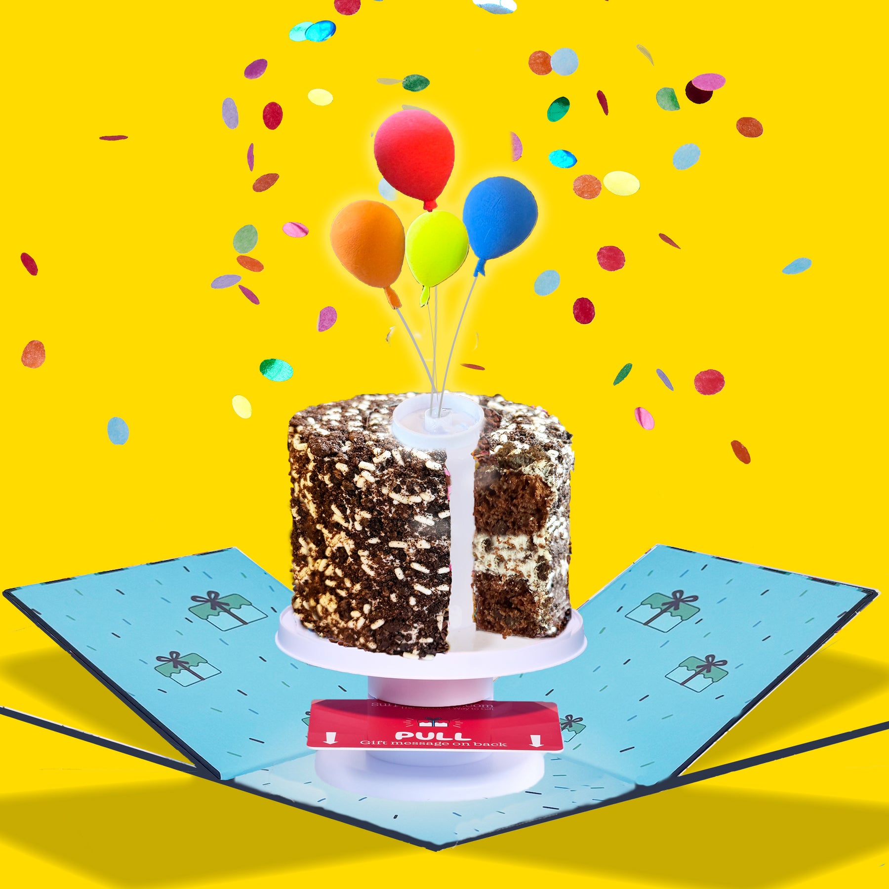 All Surprise Cakes include your choice of our delicious 4" cake, filled surprise gift pod, explosion gift box, and pull-card trigger with gift message on the back. Take your gift to the next level by adding an optional gift card from select retailers. Your gift arrives fully assembled and ready to pop on our patented mini Popping Cake Stand. And don’t worry, they won’t know it’s from you or us until their surprise POPS out!
