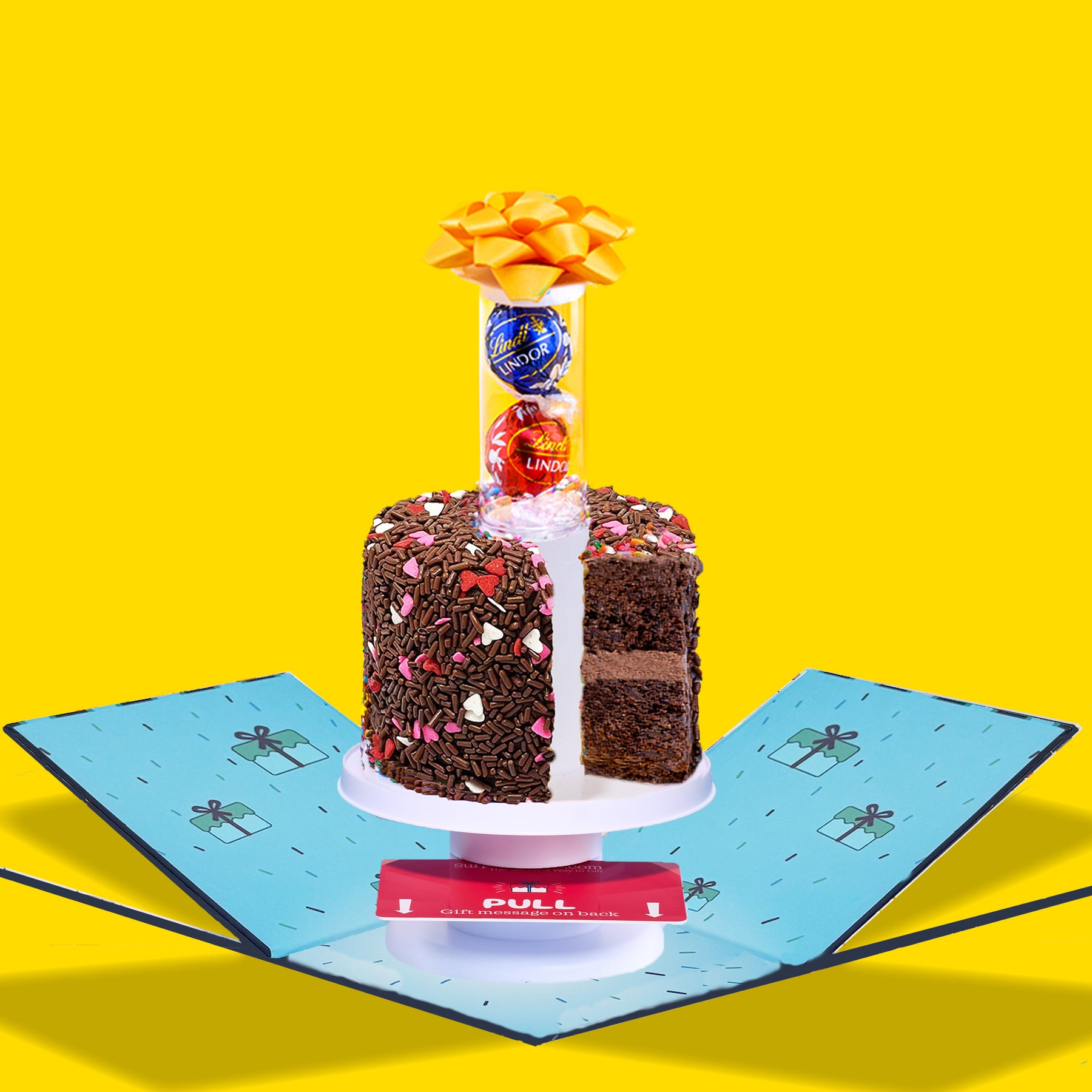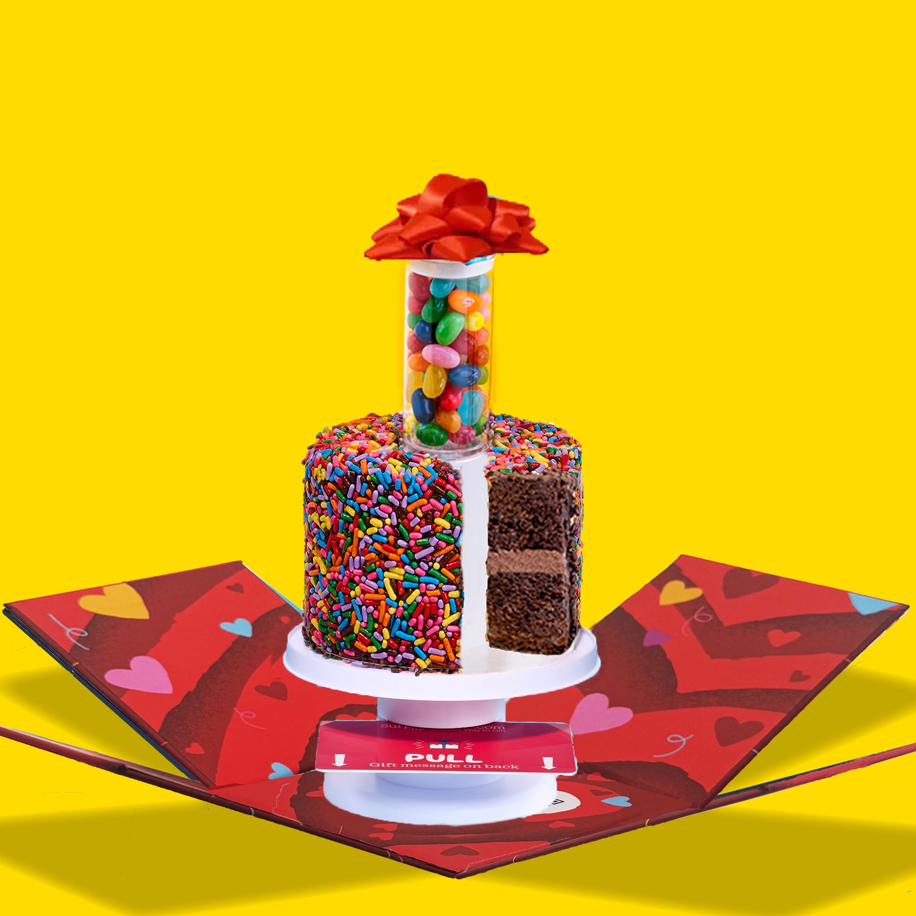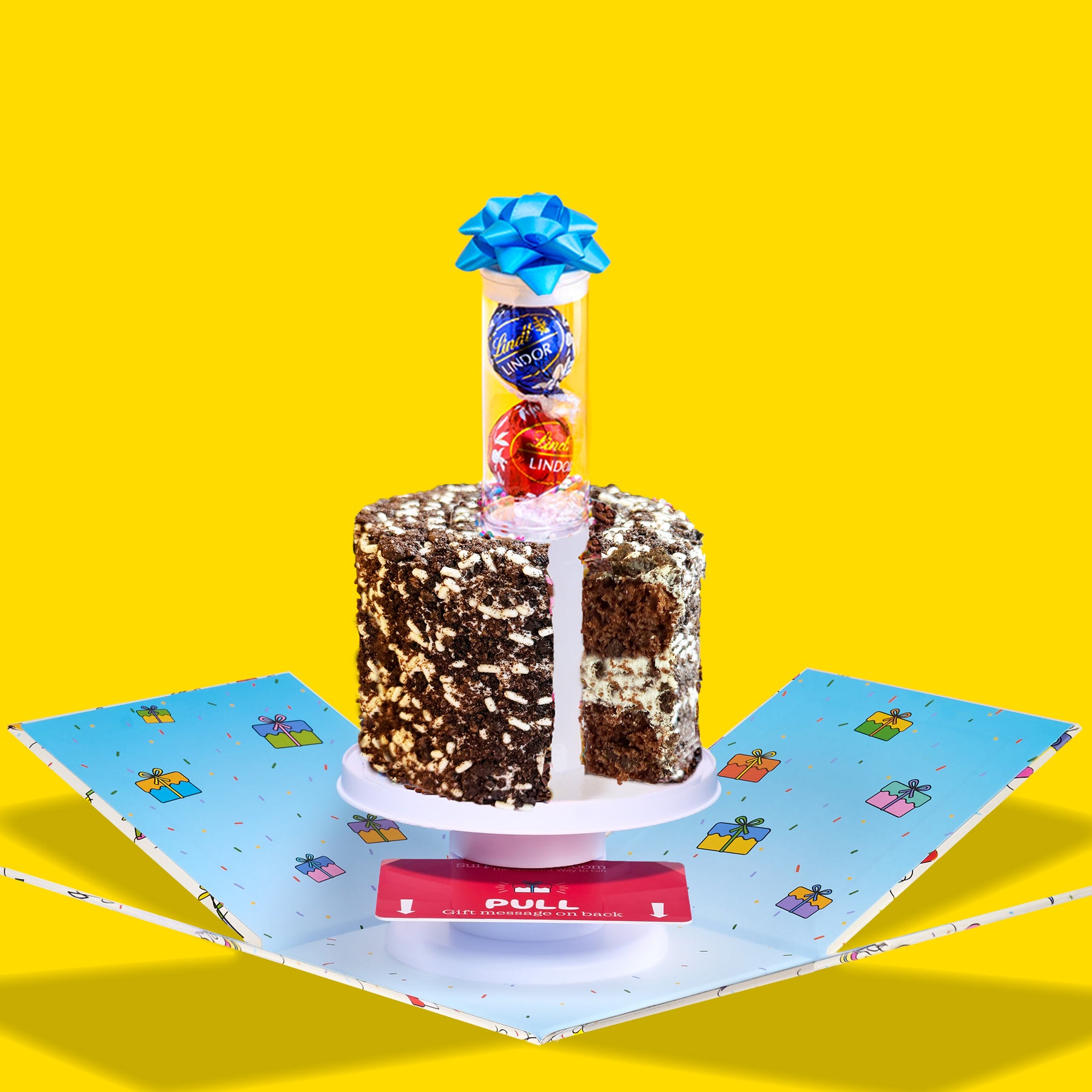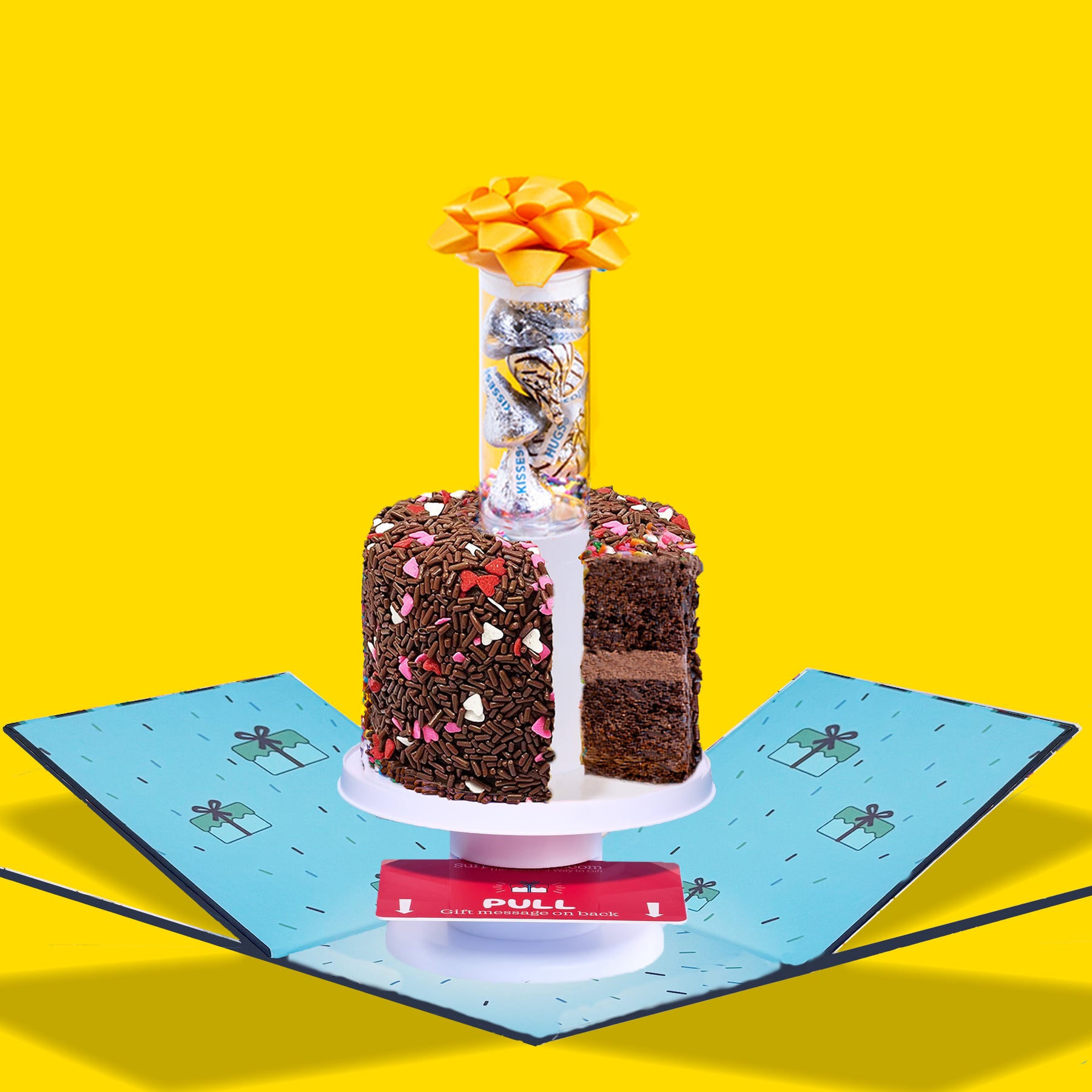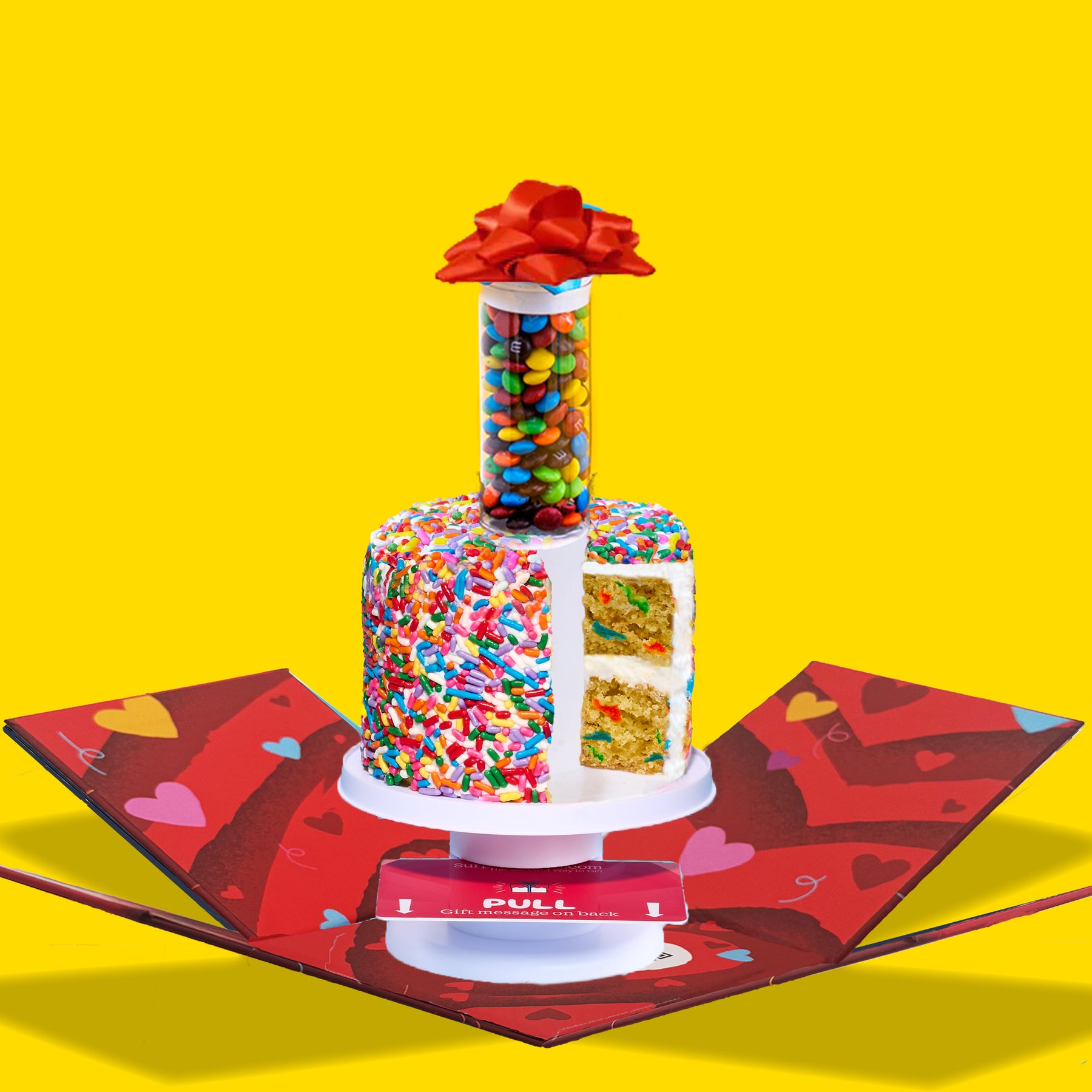 All Surprise Cakes include your choice of our delicious 4" cake, filled surprise gift pod, explosion gift box, and pull-card trigger with gift message on the back. Take your gift to the next level by adding an optional gift card from select retailers. Your gift arrives fully assembled and ready to pop on our patented mini Popping Cake Stand. And don’t worry, they won’t know it’s from you or us until their surprise POPS out!