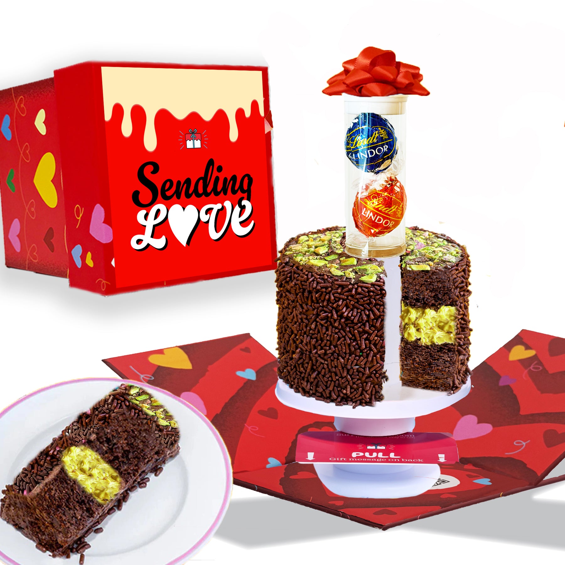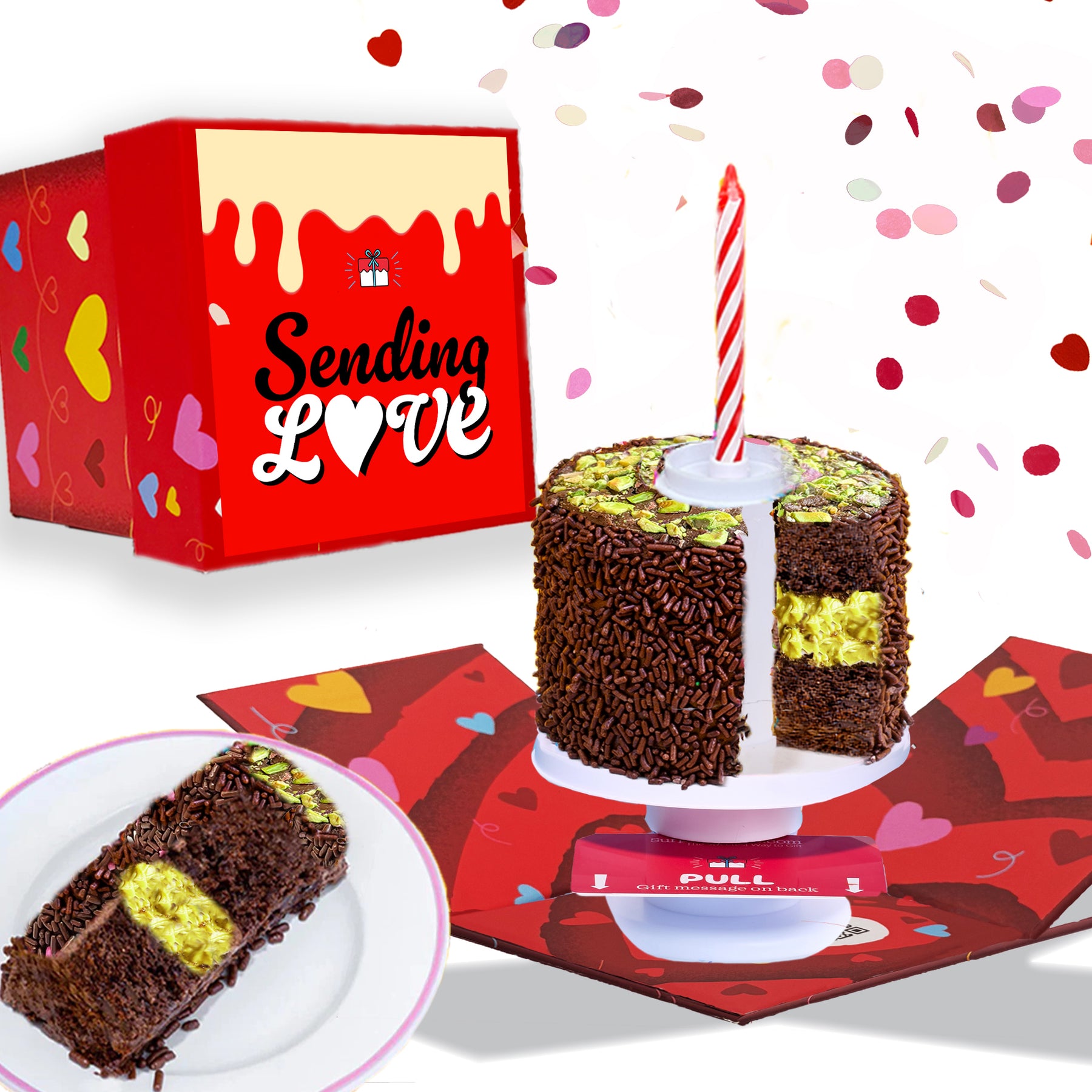 All Surprise Cakes include your choice of our delicious 4" cake, filled surprise gift pod, explosion gift box, and pull-card trigger with gift message on the back. Take your gift to the next level by adding an optional gift card from select retailers. Your gift arrives fully assembled and ready to pop on our patented mini Popping Cake Stand. And don’t worry, they won’t know it’s from you or us until their surprise POPS out!