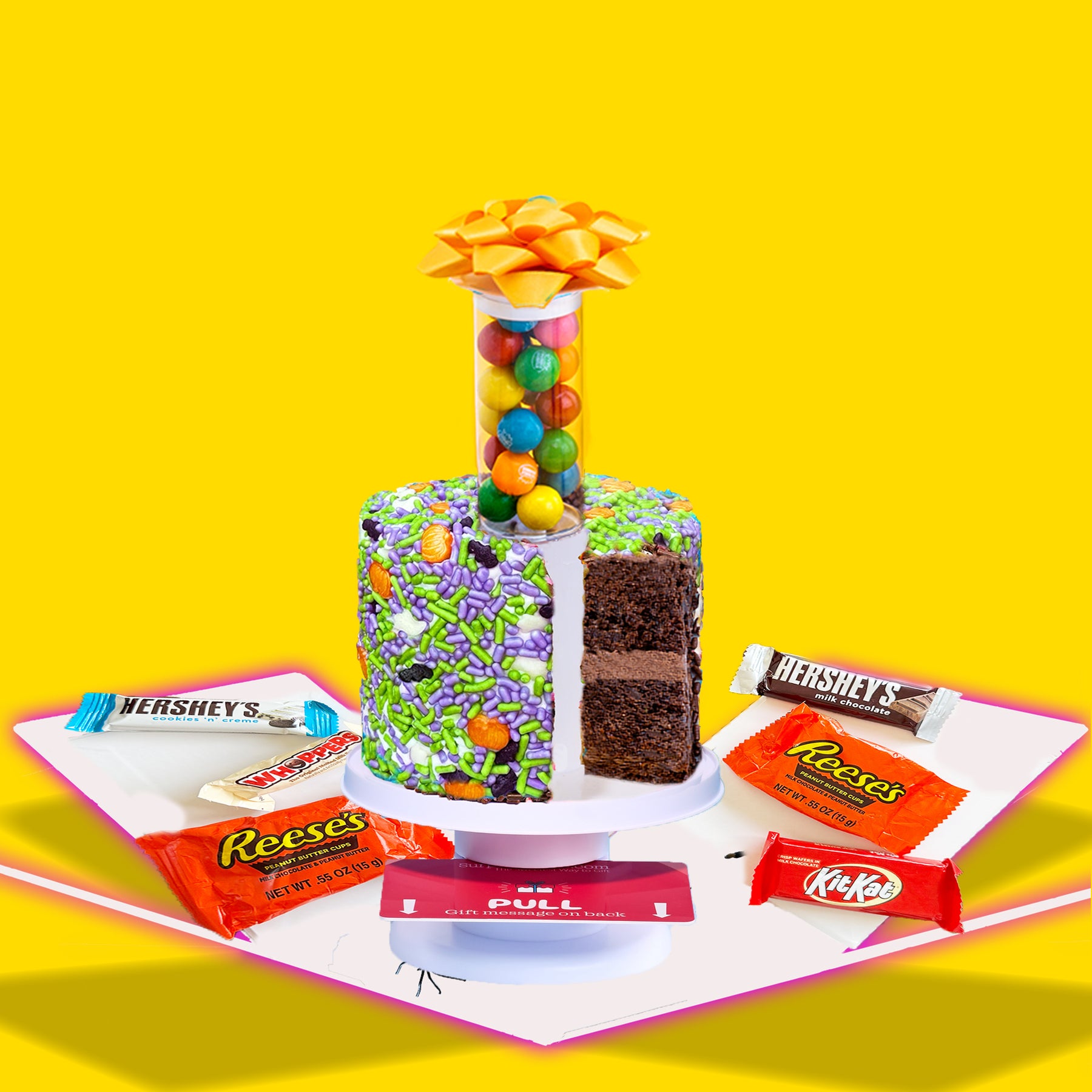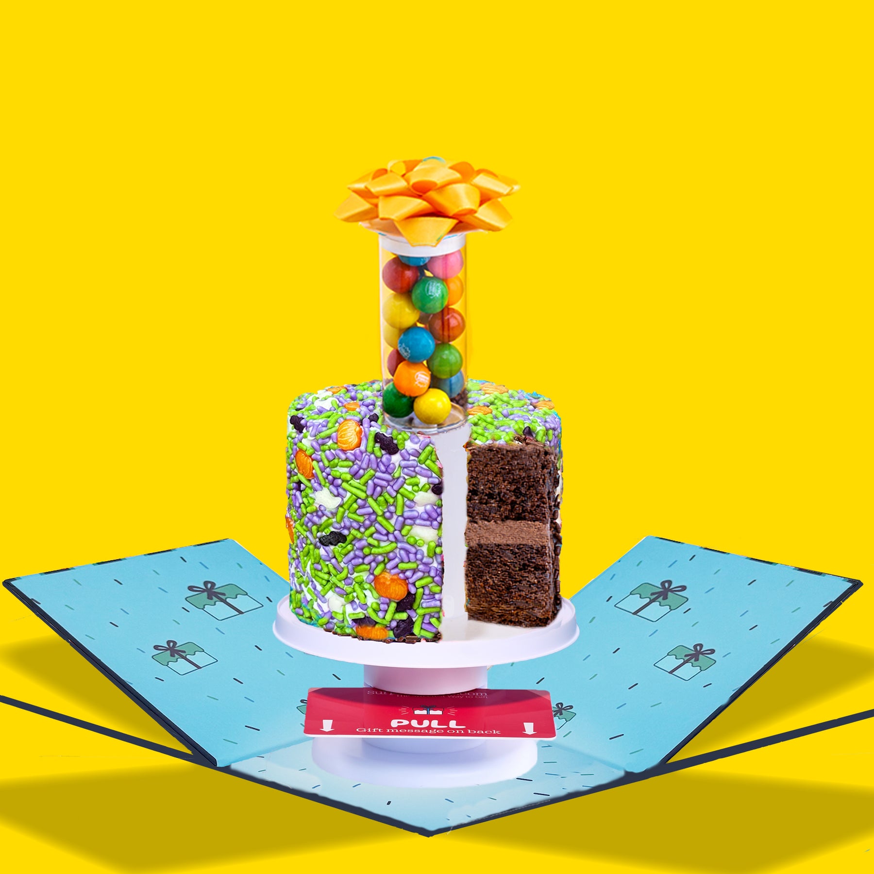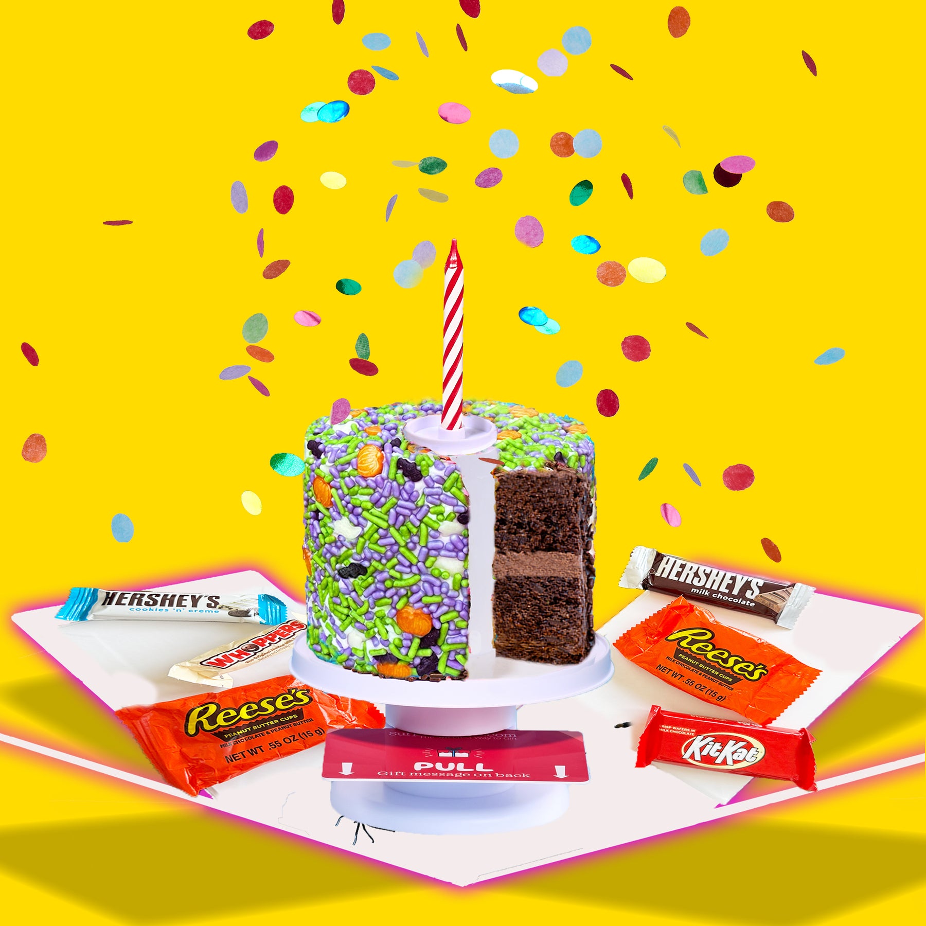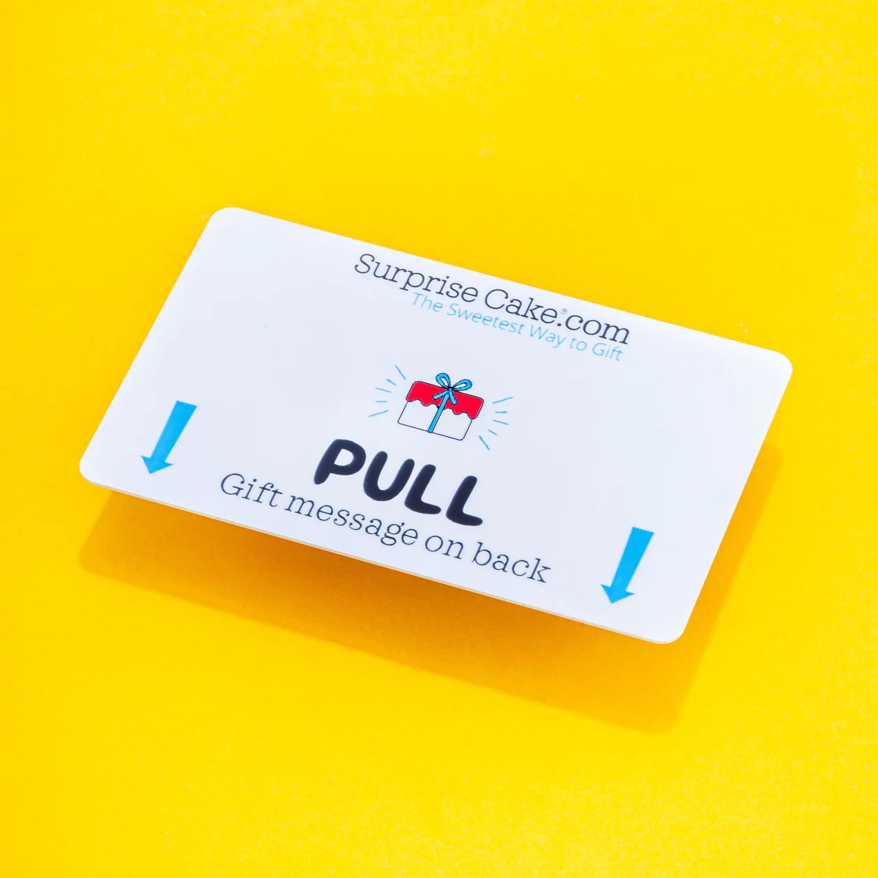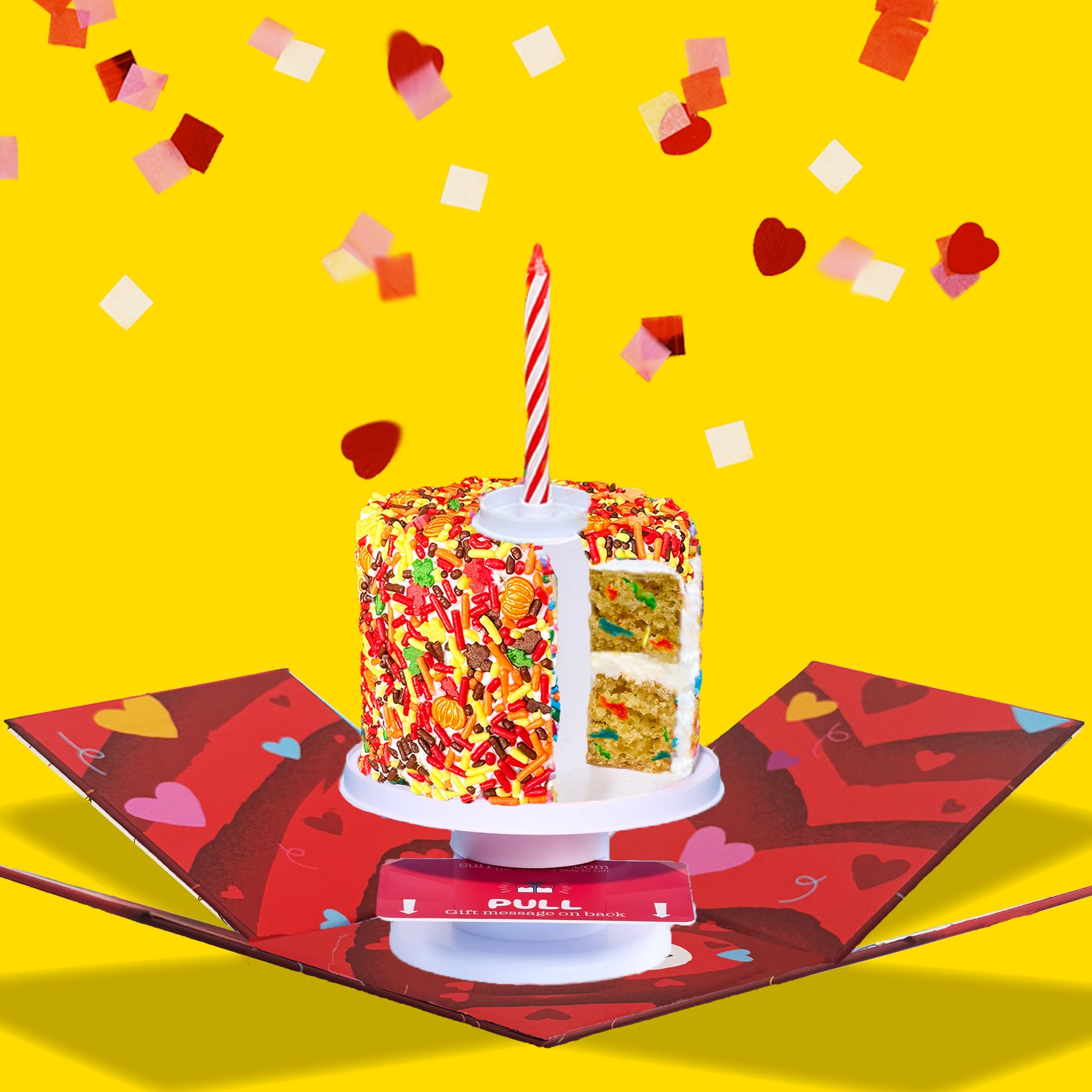 All Surprise Cakes include your choice of our delicious 4" cake, filled surprise gift pod, explosion gift box, and pull-card trigger with gift message on the back. Take your gift to the next level by adding an optional gift card from select retailers. Your gift arrives fully assembled and ready to pop on our patented mini Popping Cake Stand. And don’t worry, they won’t know it’s from you or us until their surprise POPS out!