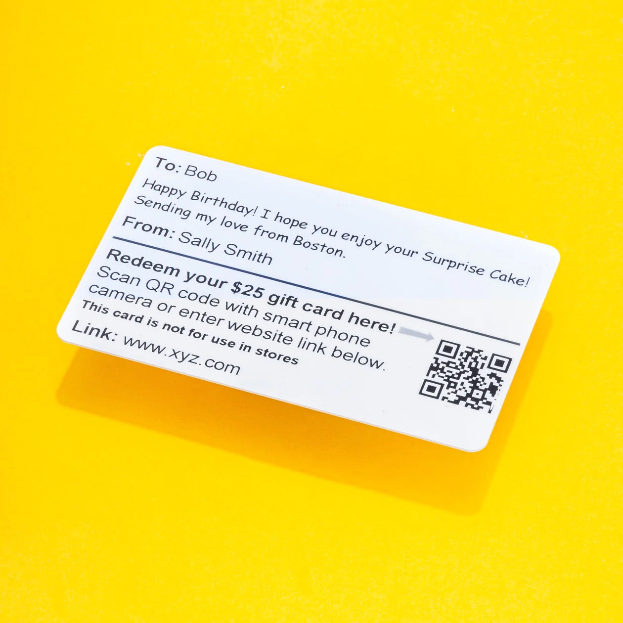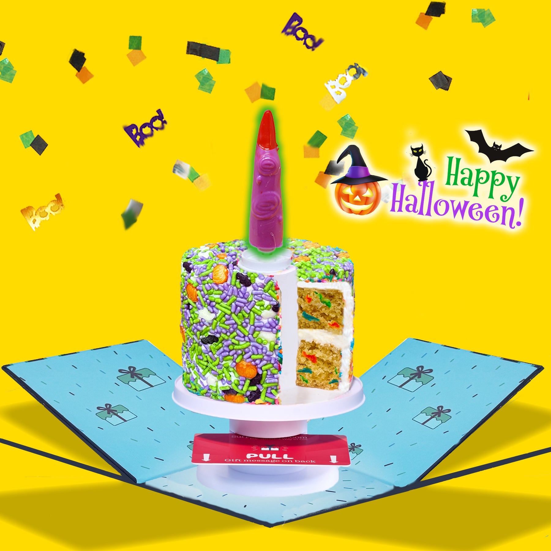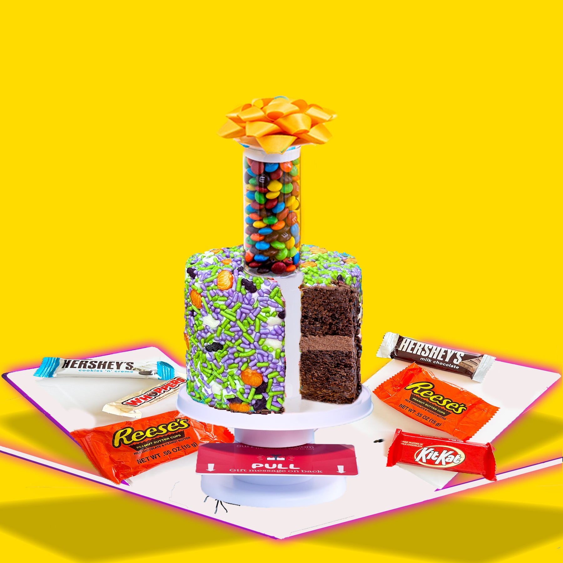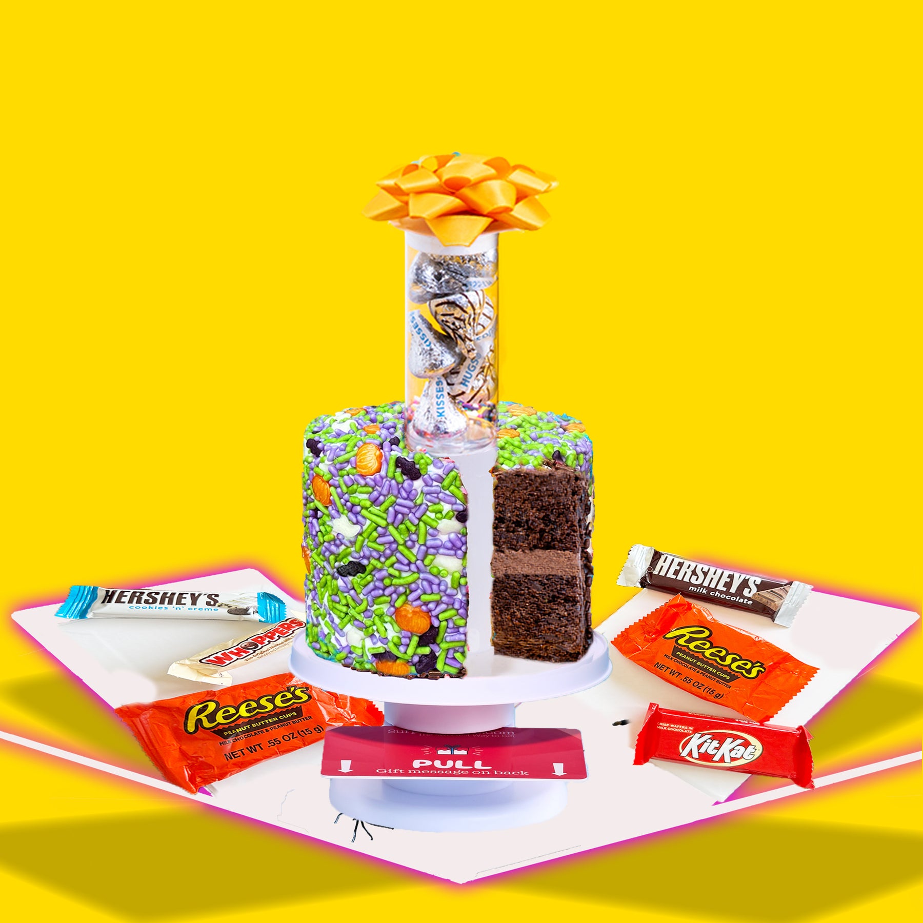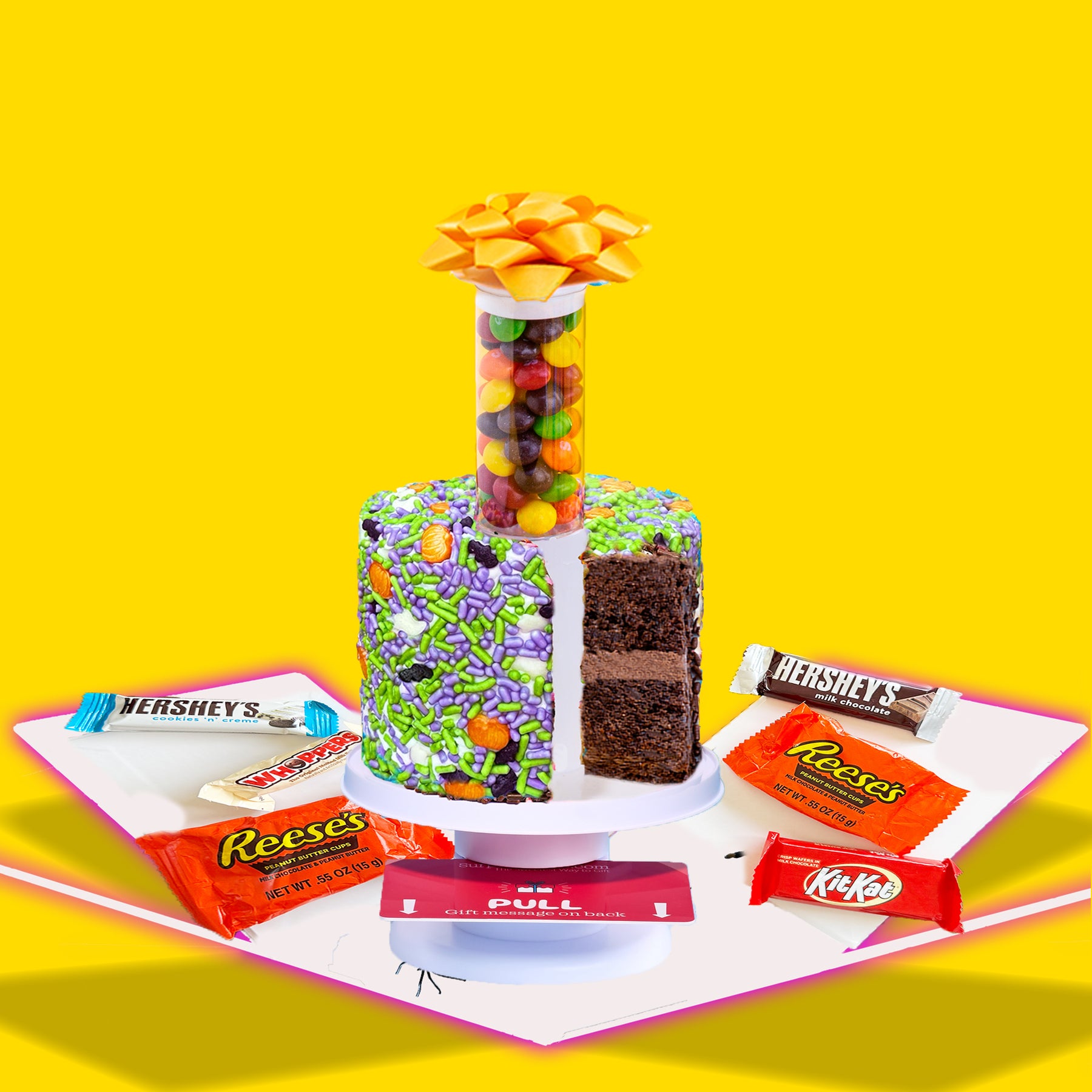 All Surprise Cakes include your choice of our delicious 4" cake, filled surprise gift pod, explosion gift box, and pull-card trigger with gift message on the back. Take your gift to the next level by adding an optional gift card from select retailers. Your gift arrives fully assembled and ready to pop on our patented mini Popping Cake Stand. And don’t worry, they won’t know it’s from you or us until their surprise POPS out!